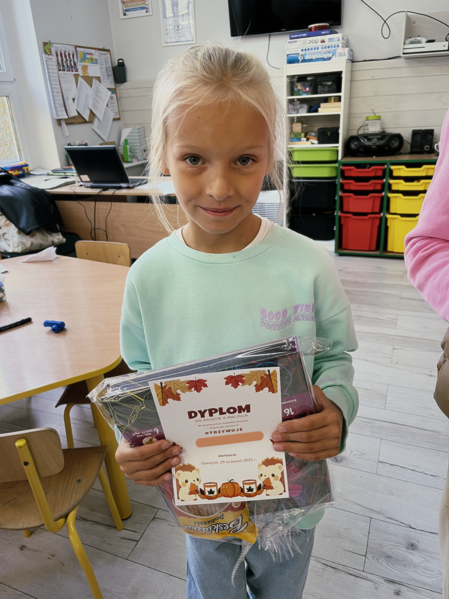 06.10.2025 09:58W dniu 30.09.2025 r. odbyło się uroczyste pasowanie na świetliczaka 🎊. Uczniowie klasy I stawili czoła licznym próbom, podczas których musieli wykazać się wiedzą i umiejętnościami, zanim zostali przyjęci do gromady świetlicowej. Zgodnie z tradycją, każdy został pasowany kredką ✏️. Na pamiątkę tego wyjątkowego wydarzenia dzieci otrzymały dyplomy oraz upominki 🤩. Wychowawcy świetlicy życzą nowym świetliczakom wielu sukcesów i dużo uśmiechu! 🥰Wyniki konkursu plastycznego pt. ,,Portret jesieni”.